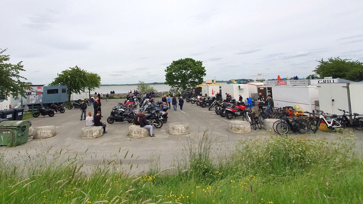 Dort angekommen wurden erst mal Moppeds geguckt. Bernd und Heidejürgen haben sich direkt wieder was zu essen bestellt, was den Rest der Teilnehmer einen kleinen Respekt abverlangte. Wir waren immer noch satt und beließen es bei Kaffee, Cola und verzogen uns auf den Deich, um das Jungvolk zu beobachten welches in Scharen einfiel…