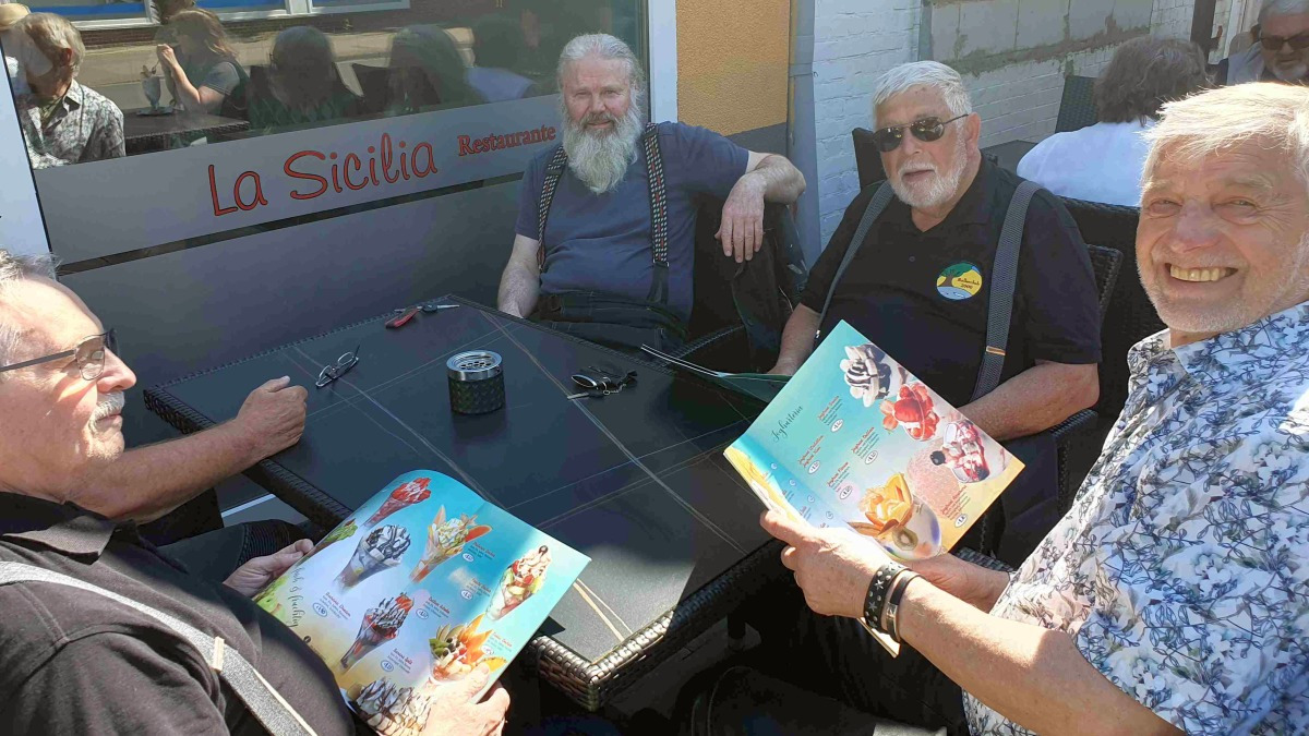 Das obligatorische Eis durfte nicht fehlen. In Loxstedt wollten wir unser Eis genießen. Das ist mit 14 Rollern nicht ganz einfach. Zuerst wurden wir von einem privaten Parkplatz „verjagt“. Das Personal der Eisdiele bot uns dann aber genug Abstellfläche für unsere Fahrzeuge an.